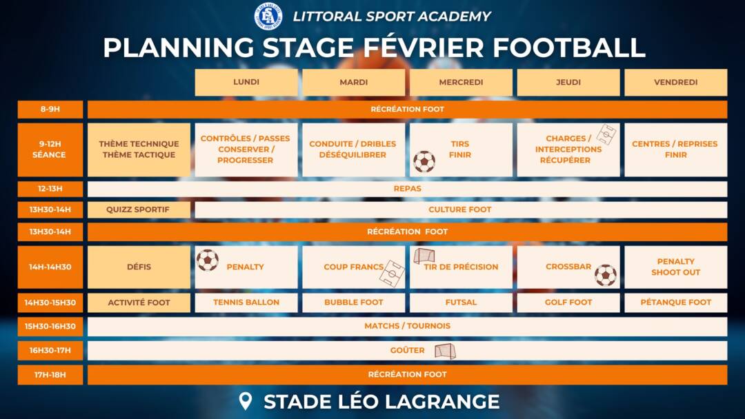 - Le stage de football organisé par l’association Littoral Sport Academy est l’occasion idéale pour les enfants âgés de 6 à 16 ans de développer leurs compétences techniques.